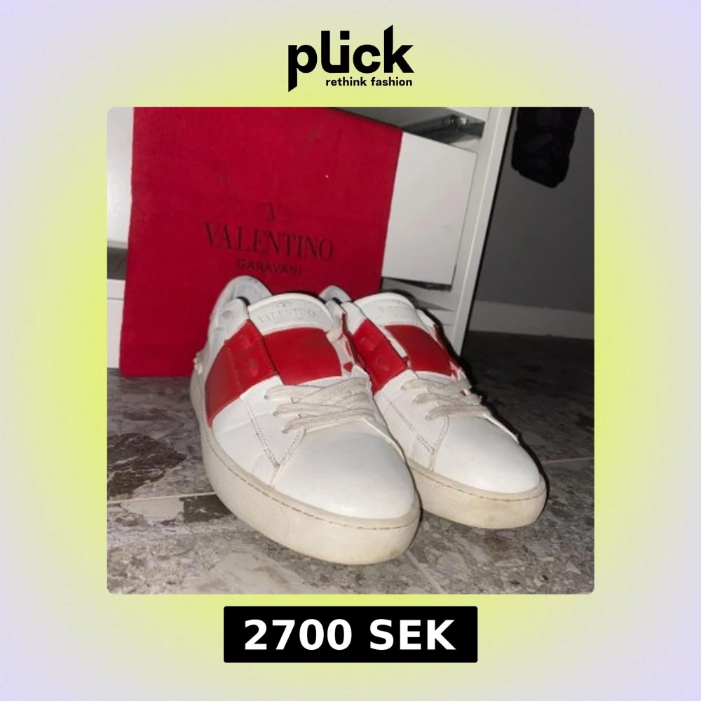 Snygga Valentino Garavani sneakers i vitt med röda detaljer. Skorna har en klassisk design med snörning och rund tå. Perfekta för att ge din outfit en lyxig touch. Väldigt bra skick och passar till allt.