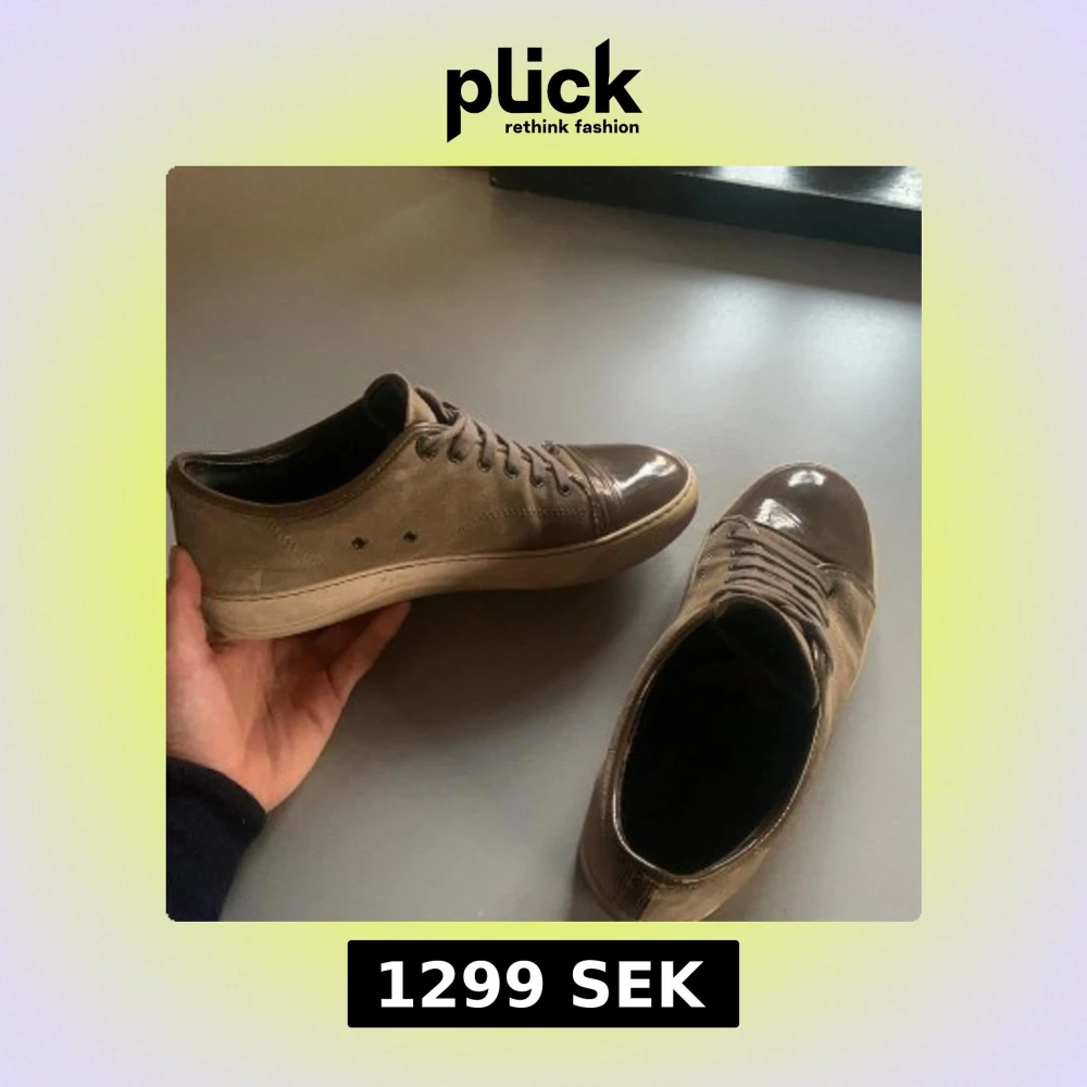 Säljer ett par bruna sneakers med snygg kombination av mocka och lackad tå. Skorna har snörning och platt sula, vilket ger en clean och stilren look. Perfekta för dig som gillar en neutral färgskala med en twist. Passar till det mesta i garderoben. Det ända felet med dem är att det är en liten skada på tån men det är bild på det och sen är inte större än en halv cm. Dem är 42 men passar 43 nästan bättre skulle jag säga. Byten är ett stort intresse!