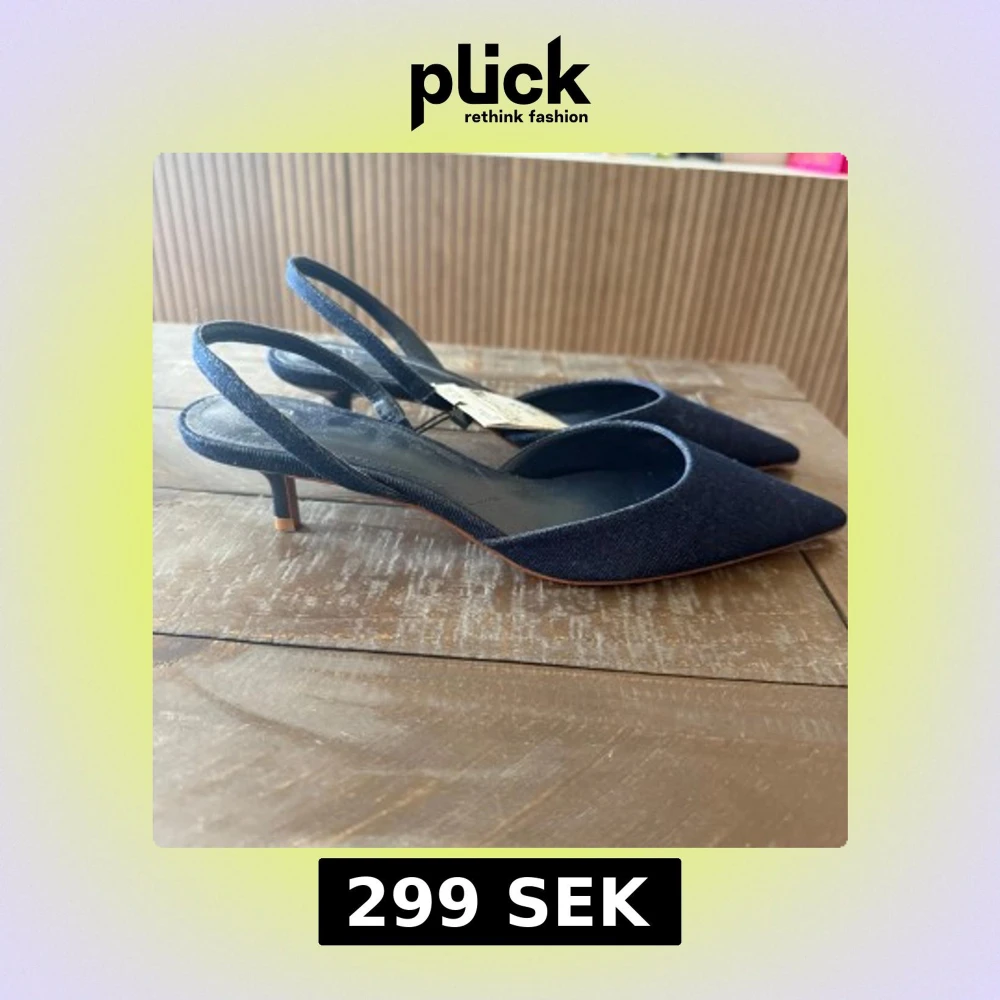 Snygga mörkblå pumps från Mango i denim med spetsig tå och låg klack. Skorna har öppen häl med rem och en stilren, minimalistisk look. Perfekta för dig som gillar trendiga detaljer och vill sticka ut med en cool jeanskänsla.