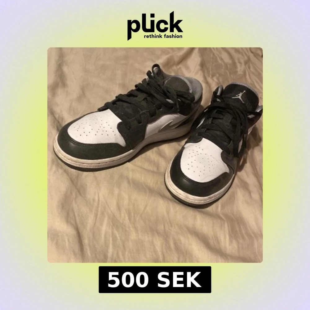 Säljer ett par Nike Air Jordans Low i svart och vitt med grå swoosh. Skorna har snörning och rund tå, klassisk design och passar perfekt till streetwear. Ikonisk Nike-logga på sidan och på plösen.