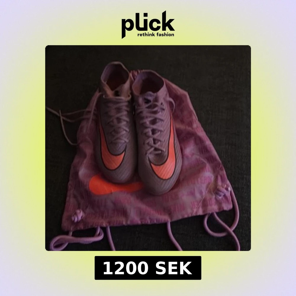 Säljer ett par Nike Mercurial fotbollsskor i lila med orange detaljer och svart swoosh. Skorna har snörning, platt sula med fasta dobbar och är tillverkade i syntetmaterial. Perfekta för dig som vill sticka ut på planen. Levereras med matchande lila Nike-påse.