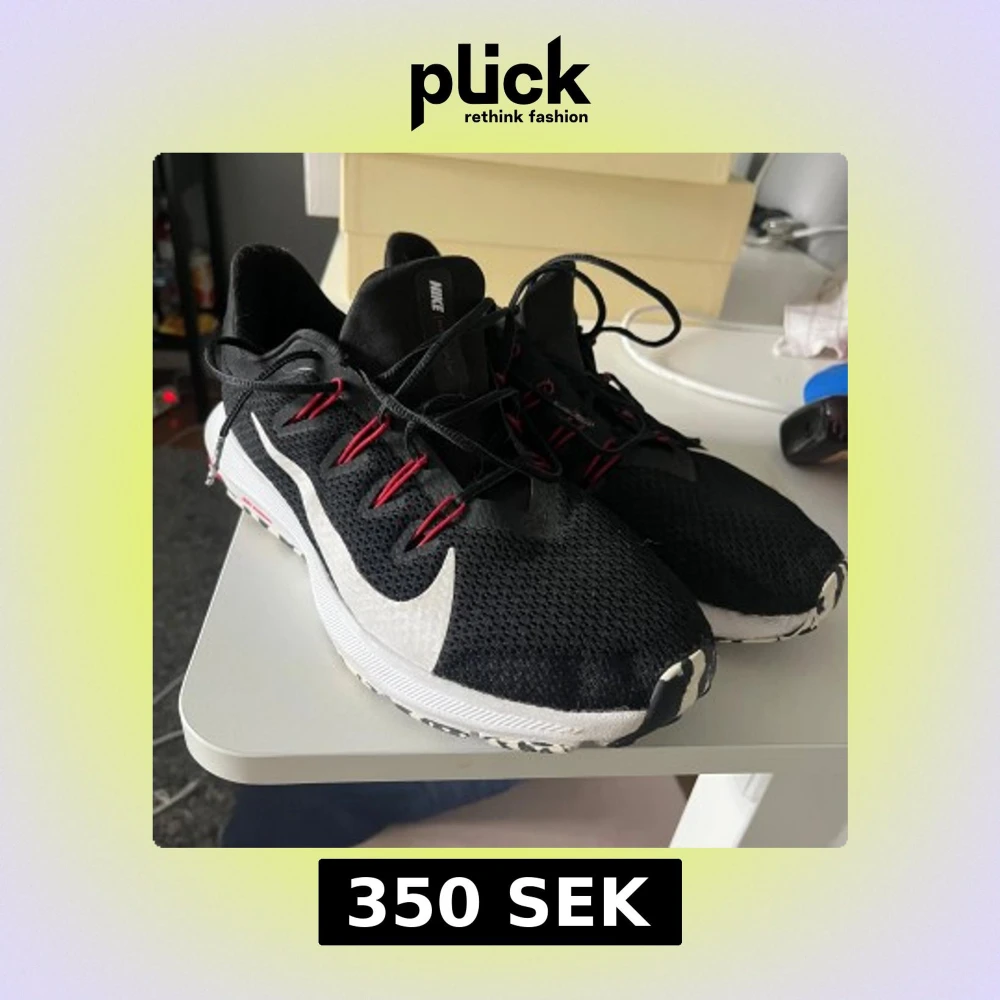 Snygga svarta Nike sneakers med vit sula och stor vit swoosh på sidan. Skorna har röda snörhål och svarta skosnören. sulan har svartvita detaljer. Perfekta för löpning eller träning.