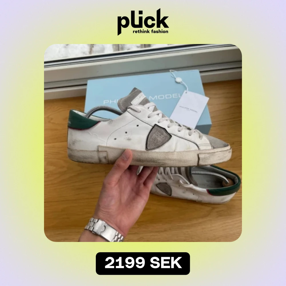 Riktigt trendiga Philippe Model skor i färgen vit/grön. Mycket bra skick ca 8/10 slitaget på skorna är gjort i fabrik. Storlek 43 passar 43/43.5. Kommer med box. Skriv vid minsta fråga/fundering! Pris ej hugget i sten!
