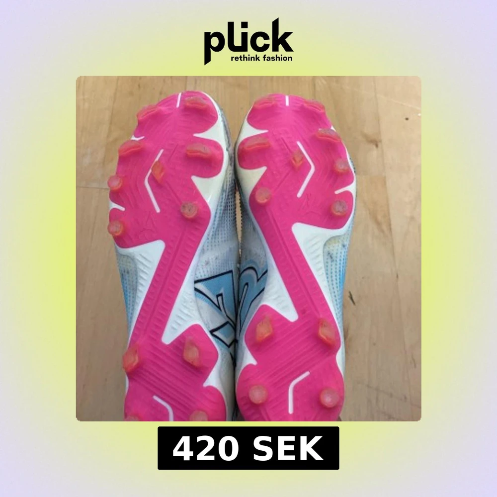 Säljer ett par snygga Puma fotbollsskor i vitt med svarta detaljer och blå inslag. Skorna har rosa dobbar och sula, samt snörning för bra passform. Perfekta för dig som vill sticka ut på planen med stilren design och färgglada detaljer.
