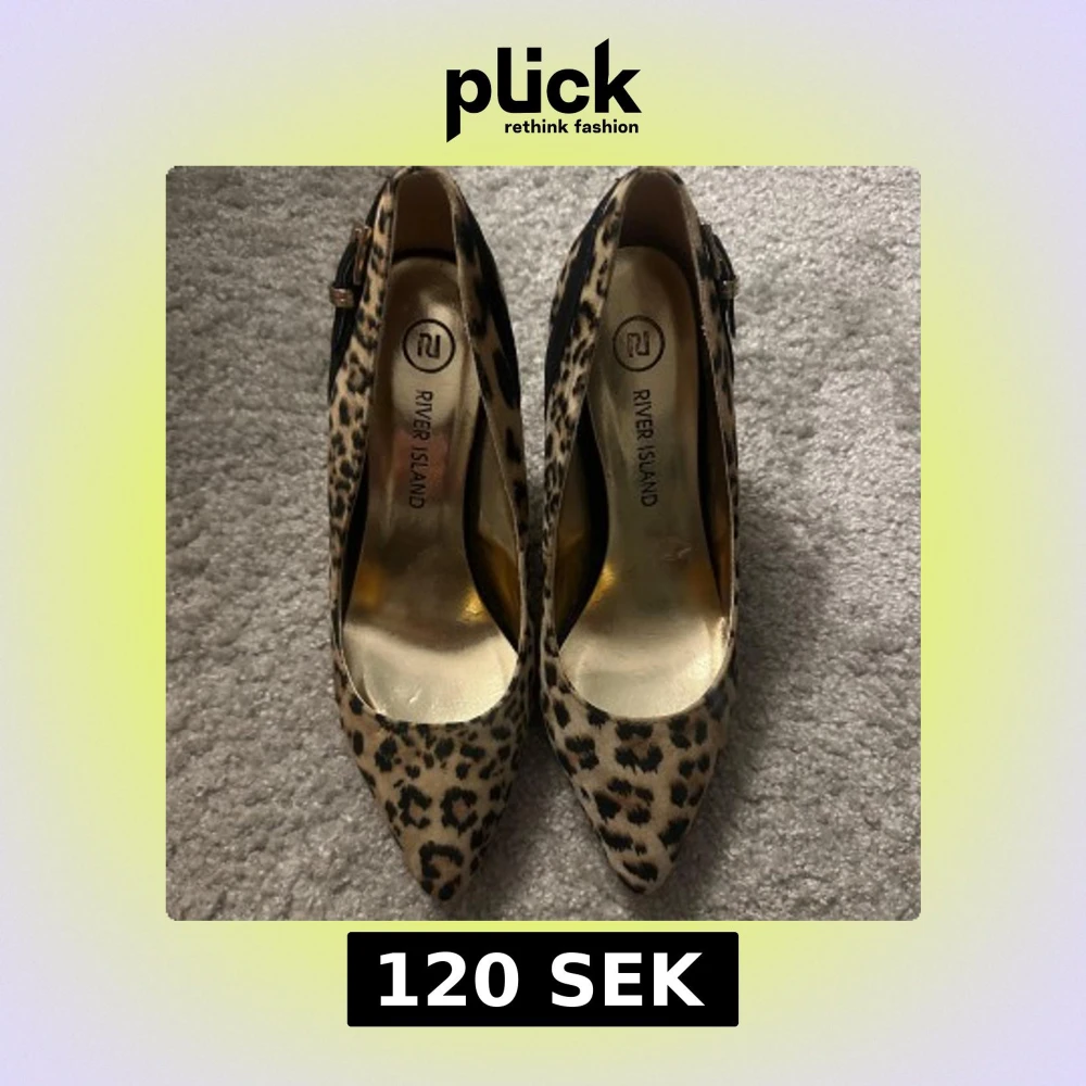 Snygga pumps från River Island i leopardmönster med spetsig tå med klack. Skorna har svart band och guldfärgat spänne vid hälen. Utsidan är i mockaliknande material som ger en lyxig känsla.