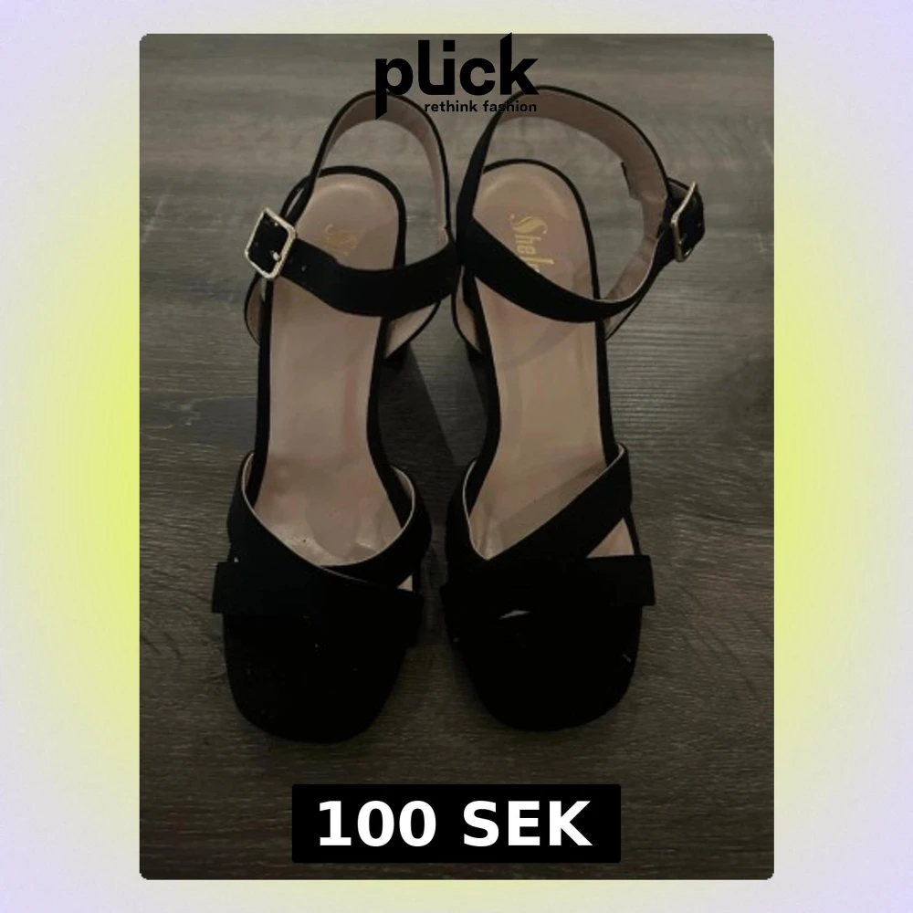 Stilrena svarta sandaler från Shele med breda remmar och justerbart spänne vid ankeln. Skorna har öppen tå och en stabil klack, perfekt för dig som gillar en klassisk look. Materialet är troligtvis syntet med mockakänsla. Fint skick.