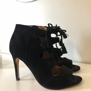 Svarta klackar i äkta mocka. Storlek 37. Går att stänga med dragkedja och knytning. Klacken är 10 cm. Köpta för 599 kr. Använda ett fåtal gånger.