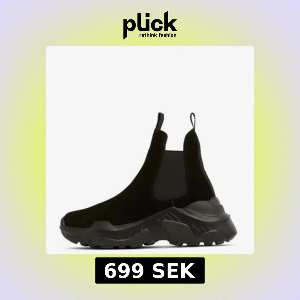 Säljer ett par chunky svarta chelsea boots med bred resår på sidorna och grov sula. Boots i mocka-look med rund tå och dragflikar både fram och bak. Perfekta för dig som vill ha en edgy och trendig stil. 1499 kr nypris