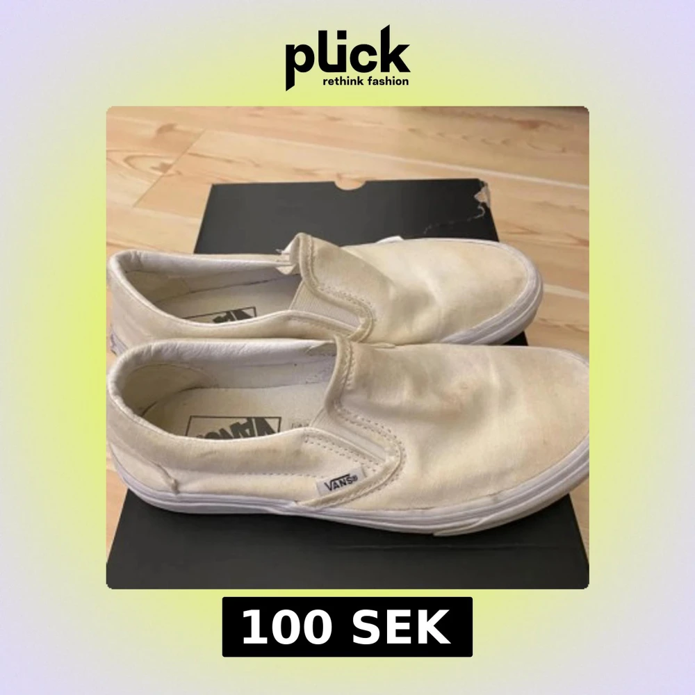 Klassiska Vans, i vit canvas med låg profil och elastiska sidor för enkel påtagning. Skorna har rund tå och vit platt sula med Vans logga bak. Perfekta för en avslappnad streetstil. De har inga anmärkningar , inga skador, inte slitna.