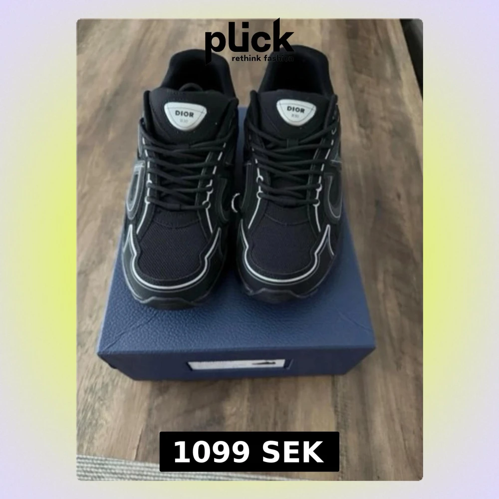 Säljer ett par svarta Di0r sneakers med vita kontrastdetaljer och snörning. Skorna har en chunky sula och meshpaneler för extra komfort. Märket syns tydligt på plösen och sidan. Perfekta för dig som vill ha en clean och modern look.