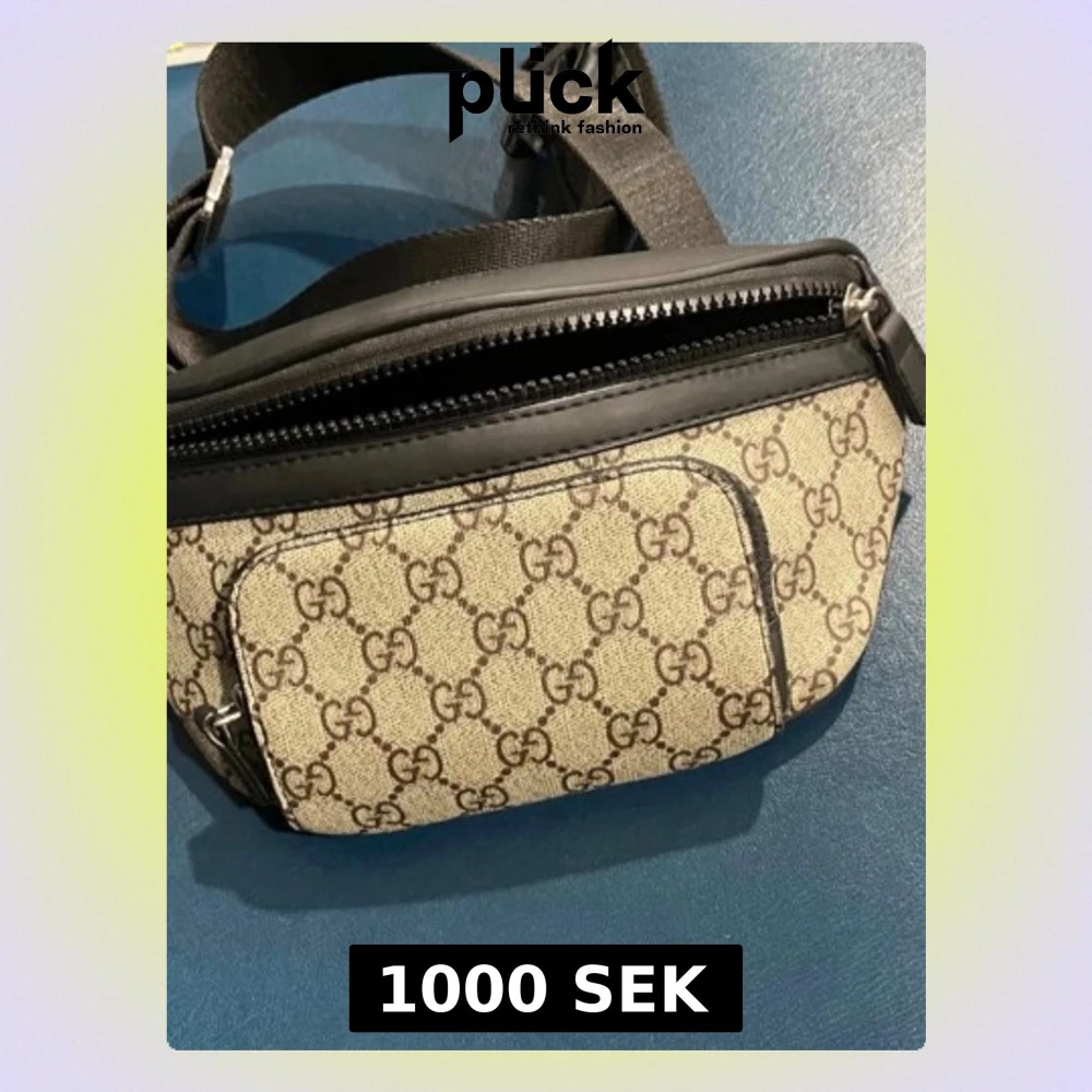 Snygg shoppingväska från Gucci i beige canvas med klassiskt GG-mönster och svarta läderdetaljer. Väskan har en framficka med dragkedja och justerbar axelrem i svart textil. Perfekt för dig som gillar lyxiga accessoarer med ikonisk design. Kan skicka fler bilder ifall du är intresserad!