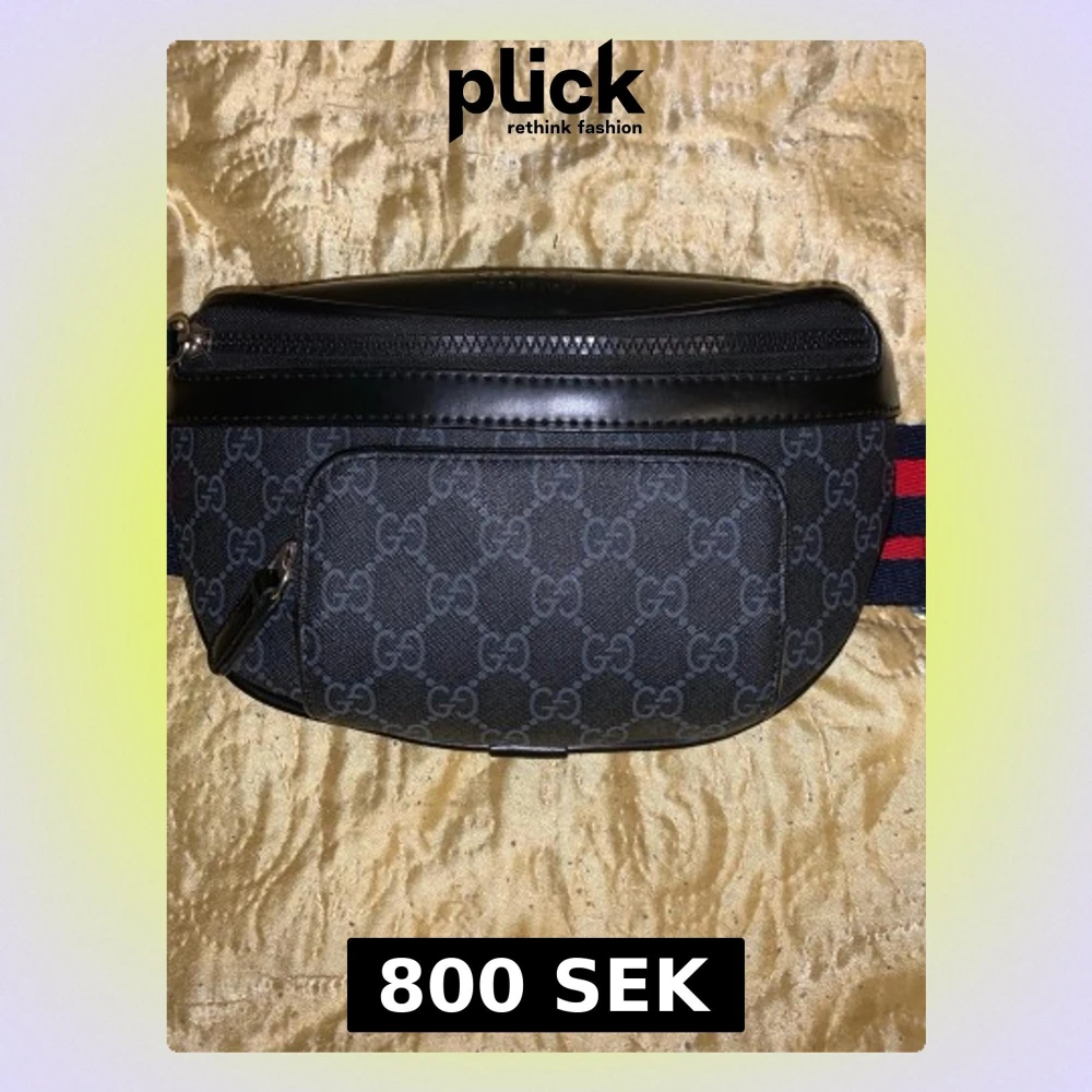 Snygg svart shoppingväska från Gucci med klassiskt GG-monogram i grått. Väskan har detaljer i svart läder, dragkedja upptill och en bred axelrem i marinblått och rött. Perfekt för dig som vill ha en trendig och praktisk accessoar.