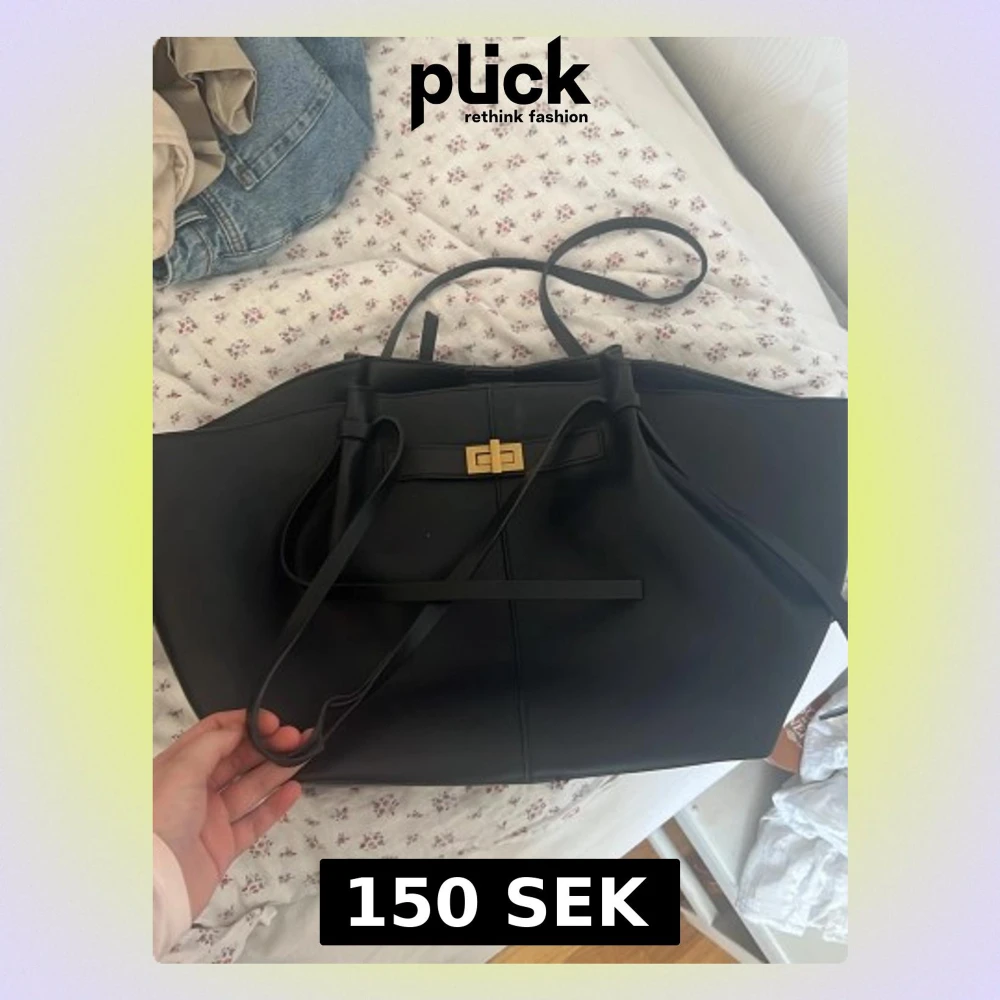 Stilren svart shoppingväska i slätt konstläder med långa handtag och snygg guldfärgad vridlåsdetalj framtill. Väskan har en rymlig form och minimalistisk design, perfekt för att bära allt du behöver. Passar till många olika outfits och är enkel att matcha.