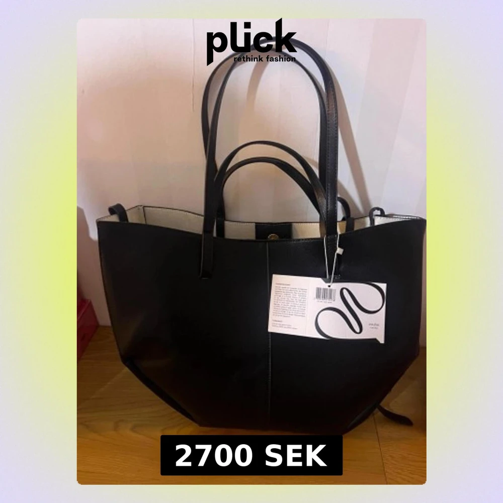 Stilren svart shoppingväska från Polène i slätt läder. Väskan har två långa handtag och två kortare, vilket gör den enkel att bära både på axeln och i handen. Insidan är ljus och väskan har en rymlig, strukturerad form som rymmer allt du behöver. Perfekt för dig som gillar minimalistisk design.
