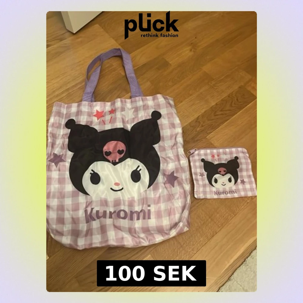 Söt shoppingväska med Kuromi-motiv från Sanrio. Väskan har ett lila och vitt rutigt mönster, lila handtag och tryck av Kuromis ansikte med stjärnor och hjärtan. Tillhörande liten förvaringspåse med samma design ingår. Tillverkad i lätt syntetmaterial.