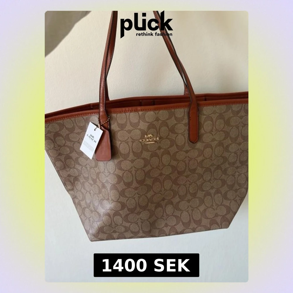 Snygg shoppingväska från Coach i brunt konstläder med klassiskt monogrammönster och guldfärgad logga framtill. Väskan har långa handtag i brunt läder och rymlig insida, perfekt för alla dina grejer. Stilsäker och tidlös design med tag och etikett kvar. (Inte köpt från hemsidan)