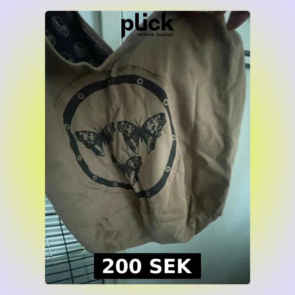 Cool brun shoppingväska i tyg med svart tryck av tre fjärilar i en cirkel på framsidan. Väskan har en innerpåse i svart tyg med mönster av fjärilar och en praktisk nyckelring med portmonnä. Rymlig inuti. Axelrem bred. Perfekt för dig som gillar unika detaljer och vill sticka ut. Aldrig använd.