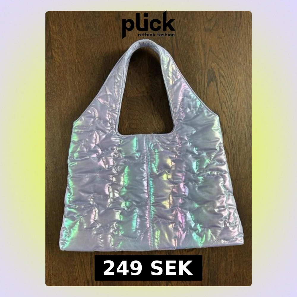 Väska från Hvisk i quiltad, iriserande material med skimrande nyanser av lila, grönt och rosa. Väskan har en bred, rektangulär form och ett stort handtag.