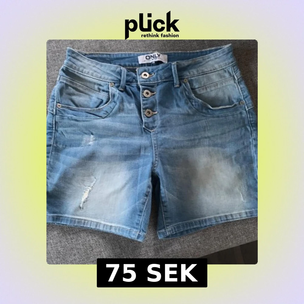 Snygga blå denimshorts från ONLY med tre knappar framtill. Klassisk femficksdesign, slitningar på framsidan och ljus tvättad look.