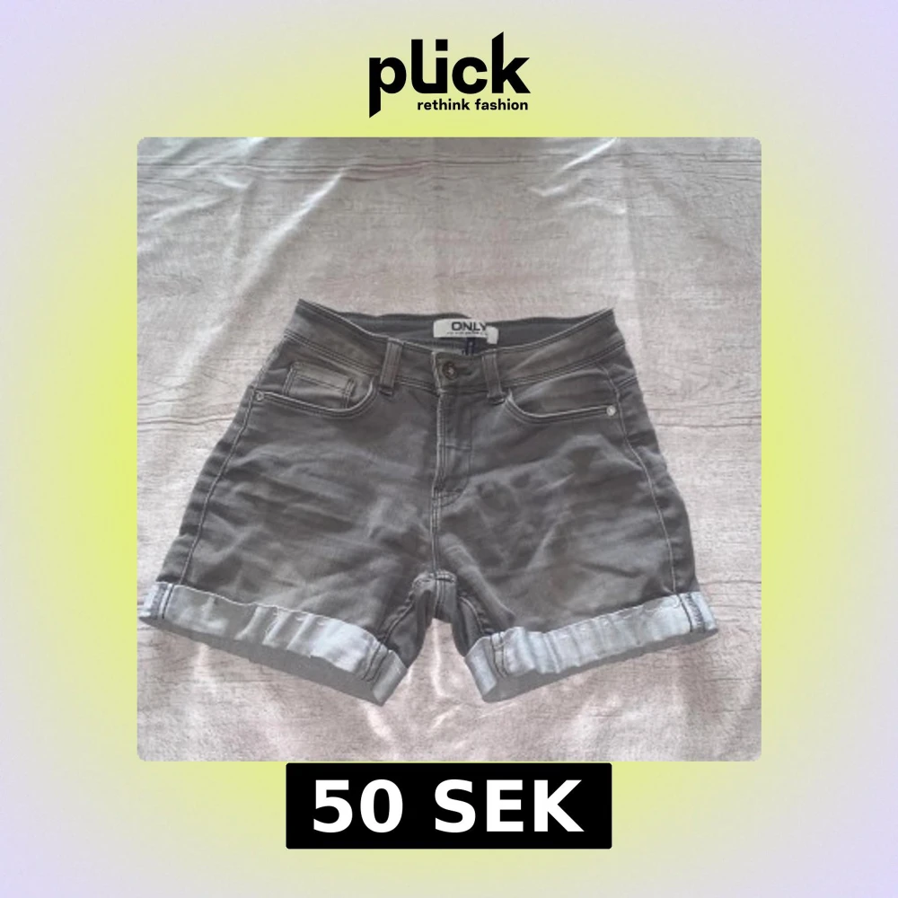 Snygga grå jeansshorts från ONLY med uppvikta benslut och klassisk femficksdesign. Modellen är högmidjad och har knapp och dragkedja framtill. Perfekta för en chill sommarlook, matcha med din favorit-t-shirt eller hoodie. Har sytt kanten själv.
