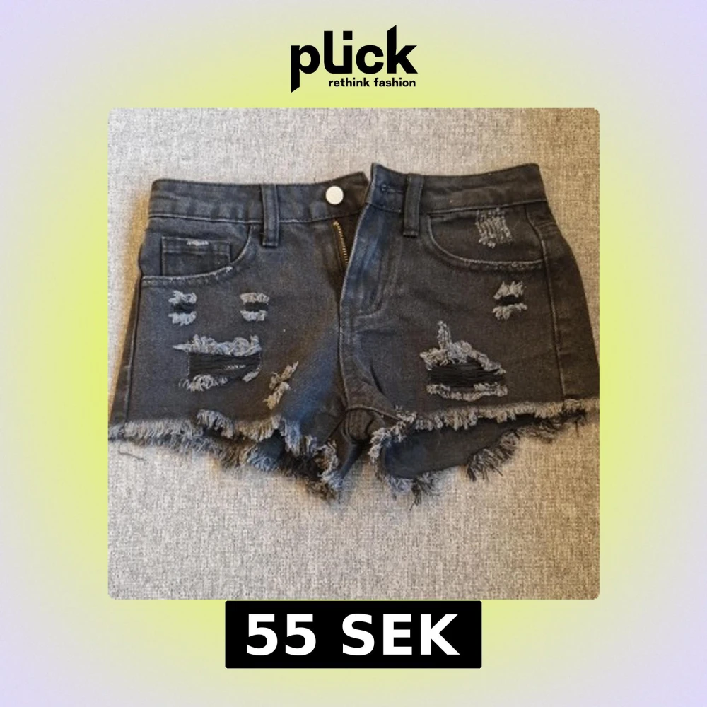 Säljer ett par svarta jeansshorts feån Shein med fransiga kanter och slitna detaljer framtill. Köpte den för ett tag sedan och har inte kommit till andvändning någon gång.