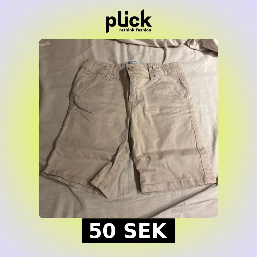 Säljer ett par beige shorts från Shill. De har en klassisk design med knappar och fickor både fram och bak. Perfekta för en avslappnad stil.