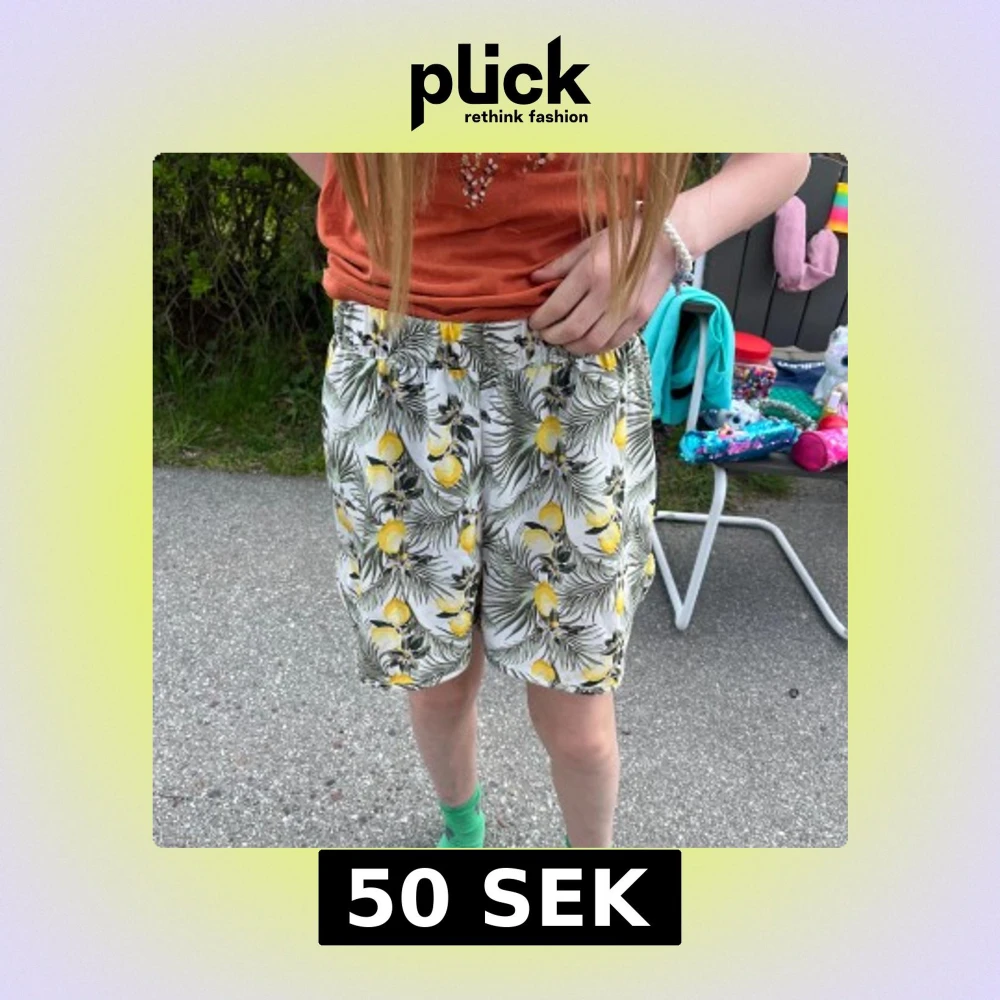 Säljer ett par vita shorts från Name It med citroner och gröna blad som mönster. De har normal passform, resår i midjan och är perfekta för sommaren. Superfräscha och lätta att matcha med en enkel topp!