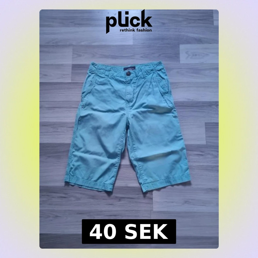 Säljer ett par turkosa shorts från H&M L.O.G.G. i storlek 164. De har normal passform, bälteshällor, knapp och dragkedja framtill samt fickor både fram och bak. Materialet är mjuk bomull, perfekta för varma dagar.