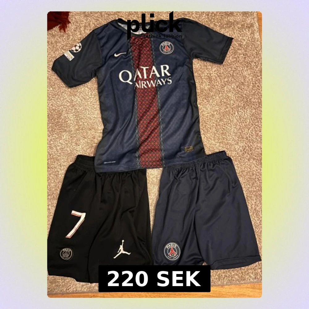 Två par PSG shorts säljes! Ena paret är svart med nummer 7, Jordan-logga och PSG-märke, andra paret är marinblå med PSG-märke. Båda har resår i midjan och är perfekta för fotboll eller träning. Snygg sportig look och officiella klubbmärken.