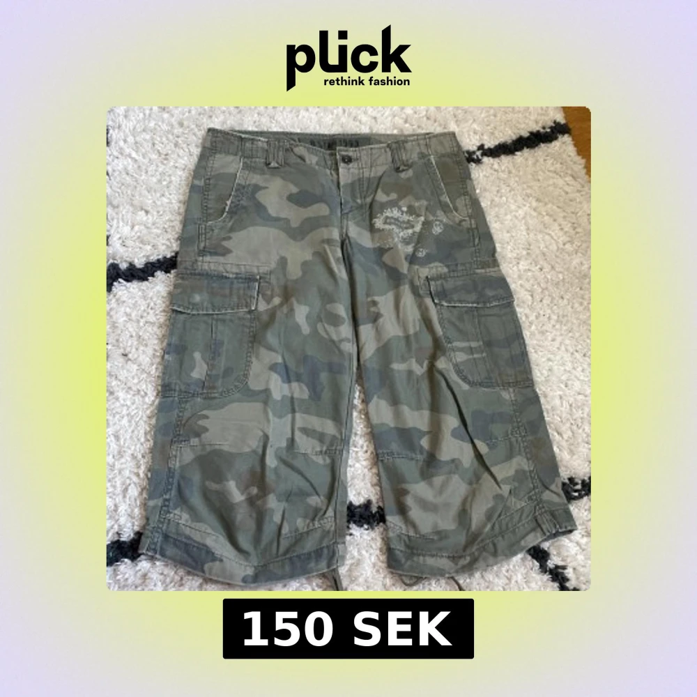 Jätte coola Cargoshorts/jorts i grönt camouflage med flera fickor och tryckdetaljer på ena benet. Säljer då de inte passar mig. Midjemått 41cm rakt över, säljer endast via instabox
