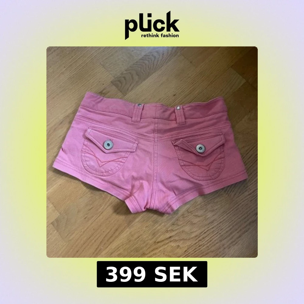 Säljer ett par rosa jeansshorts med låg midja och coola fickdetaljer både fram och bak. Shortsen har bälteshällor, knappar och dragkedja framtill samt dekorativa sömmar. Perfekta för varma dagar och har en snygg, tight passform.