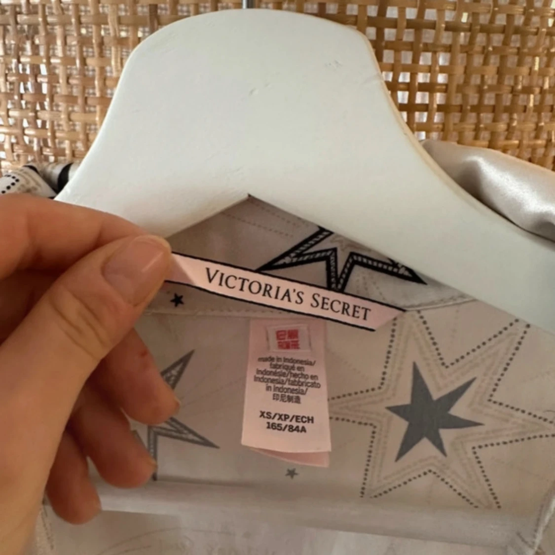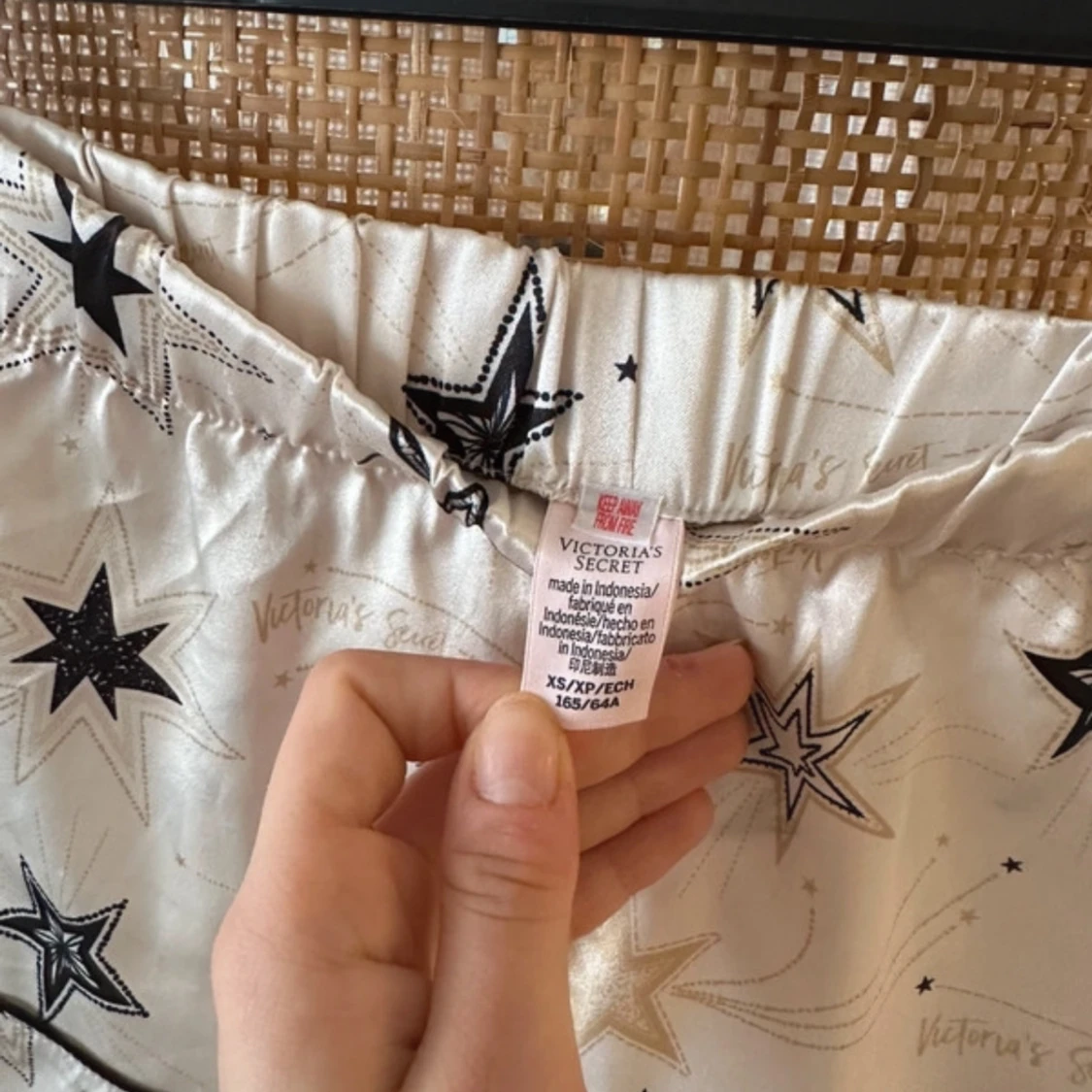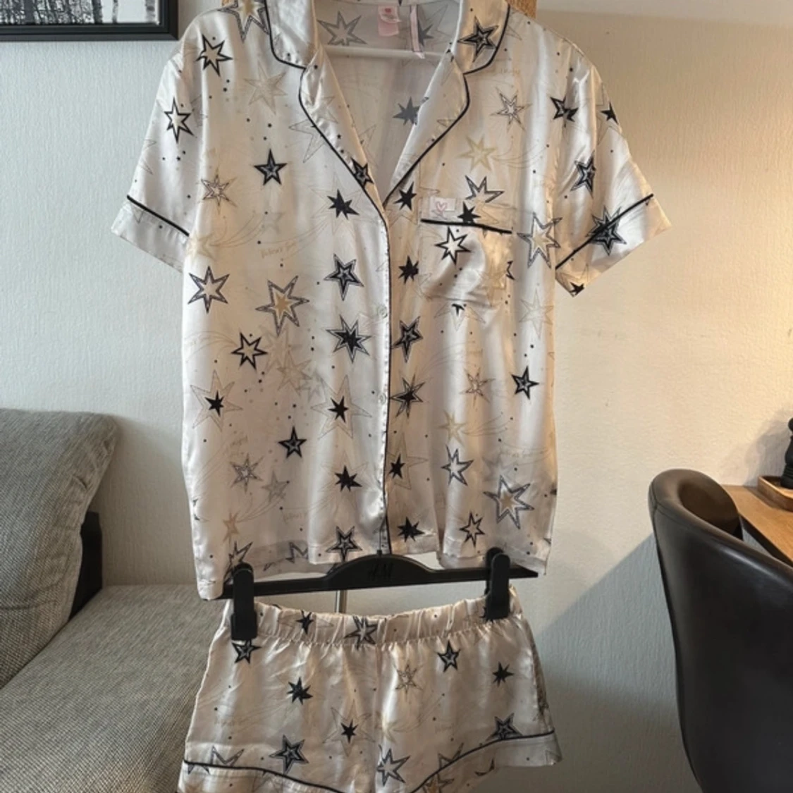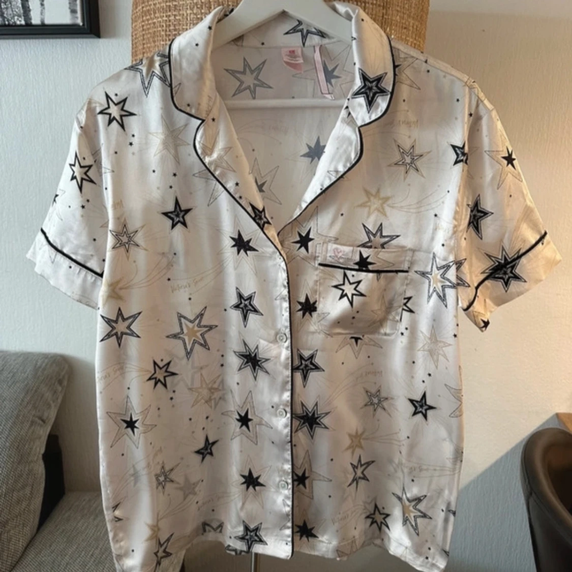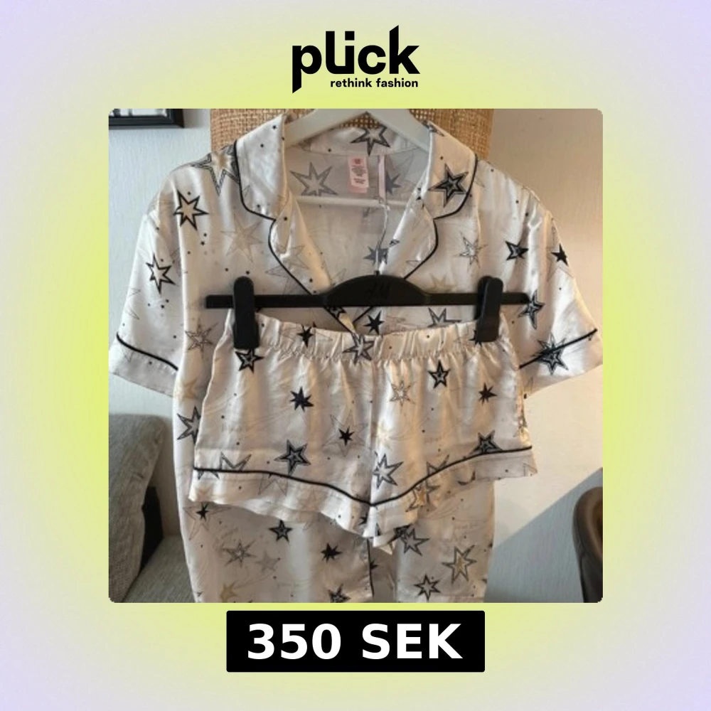 Snyggt pyjamas set från Victoria's Secret i glansigt, silkesliknande material. De är vita med svarta och guldiga stjärnor, har elastisk midja och svarta kantdetaljer. Storlek Xs-Xxs