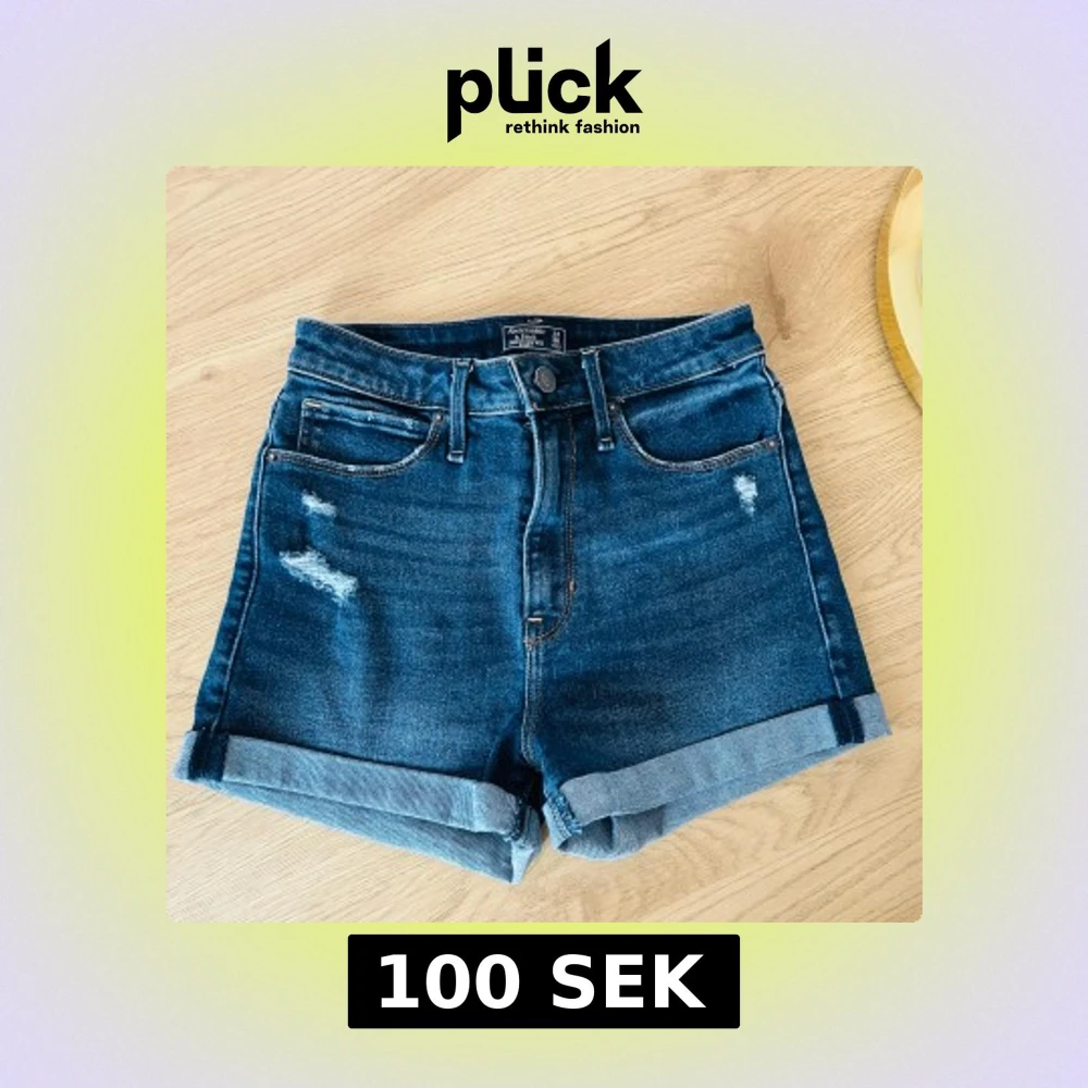 Snygga blå jeansshorts från Abercrombie & Fitch med hög midja och slitna detaljer. De har en klassisk femficksdesign och uppvikta benslut för en avslappnad look. Perfekta för sommardagar!
