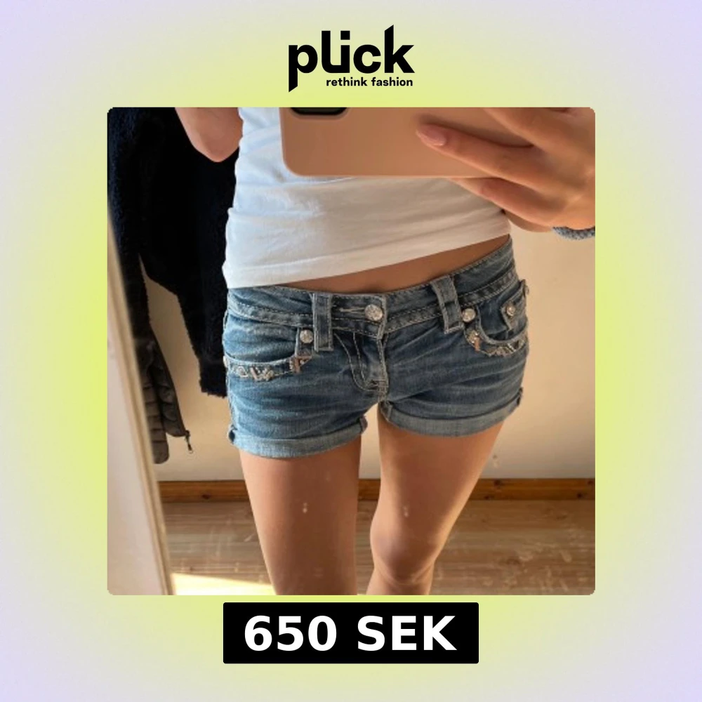 Jättesöta blå jeansshorts från Miss Me med broderade detaljer och bling på fickorna. Säljer dem då de tyvärr har blivit lite små. Midjemåttet är 34cm och grenhöjd 17cm. Pris kan diskuteras💕