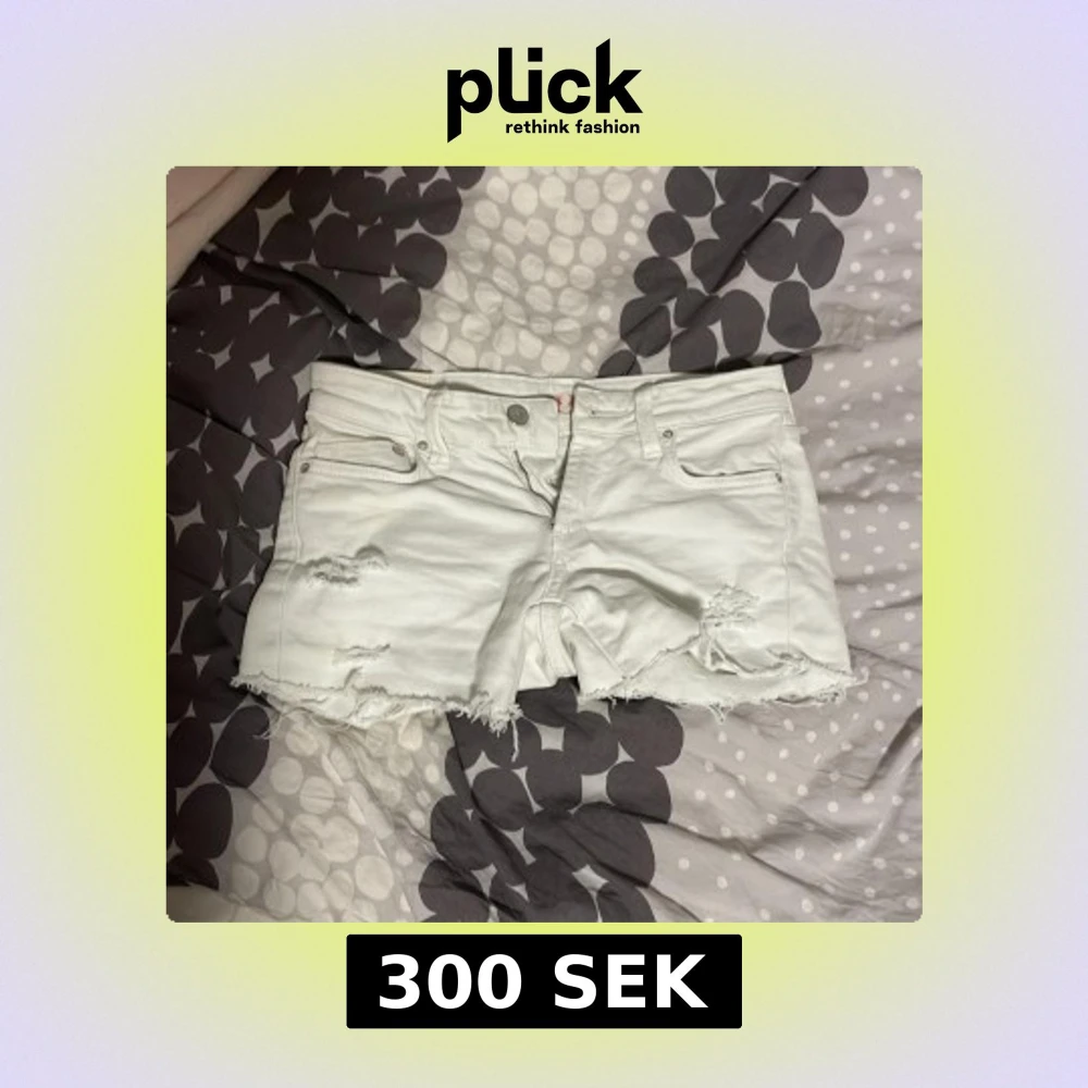Säljer ett par vita lågmidjade jeansshorts från SOIN med fransiga kanter och slitna detaljer framtill. Shortsen har fem fickor och klassisk knappgylf. Perfekta för varma dagar och en avslappnad stil. Säljer då de är för små.💕Ge förslag på ett bra pris!