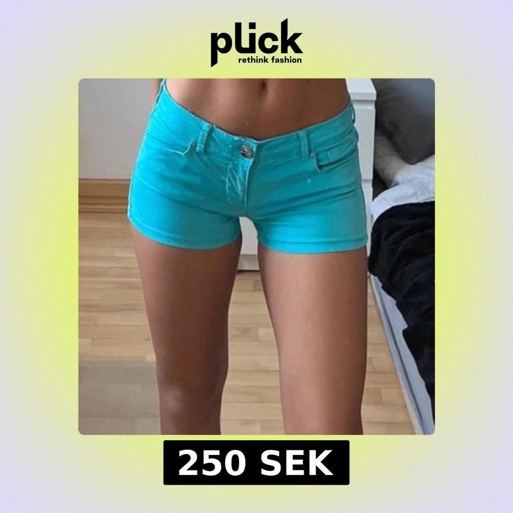 Snygga turkosa jeansshorts som är lågmidjade och har en liten scrunch vid baksidan. Oanvända och vintage.