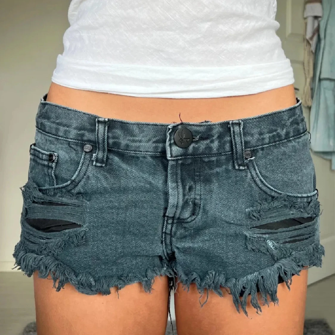 Snygga svarta jeansshorts från One Teaspoon med låg midja, slitna detaljer och fransig kant. Klassisk femficksmodell med knapp och dragkedja framtill. Perfekta för en edgy och avslappnad stil.