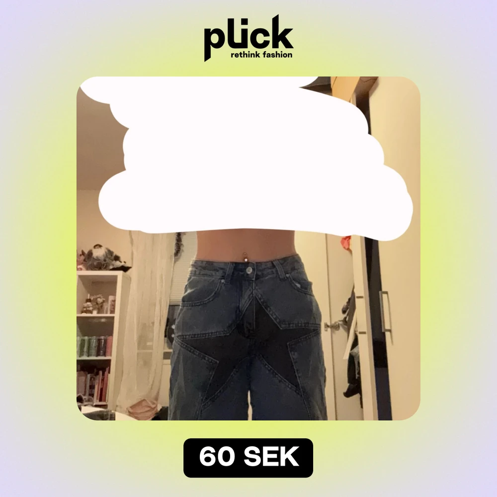 Säljer ett par coola blå jeansshorts med en stor stjärna i mörkare denim. Ny med taggar kvar. Storlek S