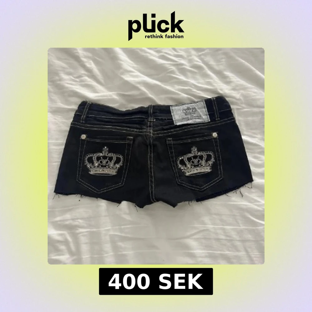 Svarta jeansshorts från Victoria Beckham for Rock & Republic med rå kant och kontrastsömmar. Baksidan har två fickor med broderade silverkronor och logga. Klassisk femficksmodell med knapp och dragkedja framtill. Perfekta för en edgy streetstil. Sitter som xxs men står storlek 30