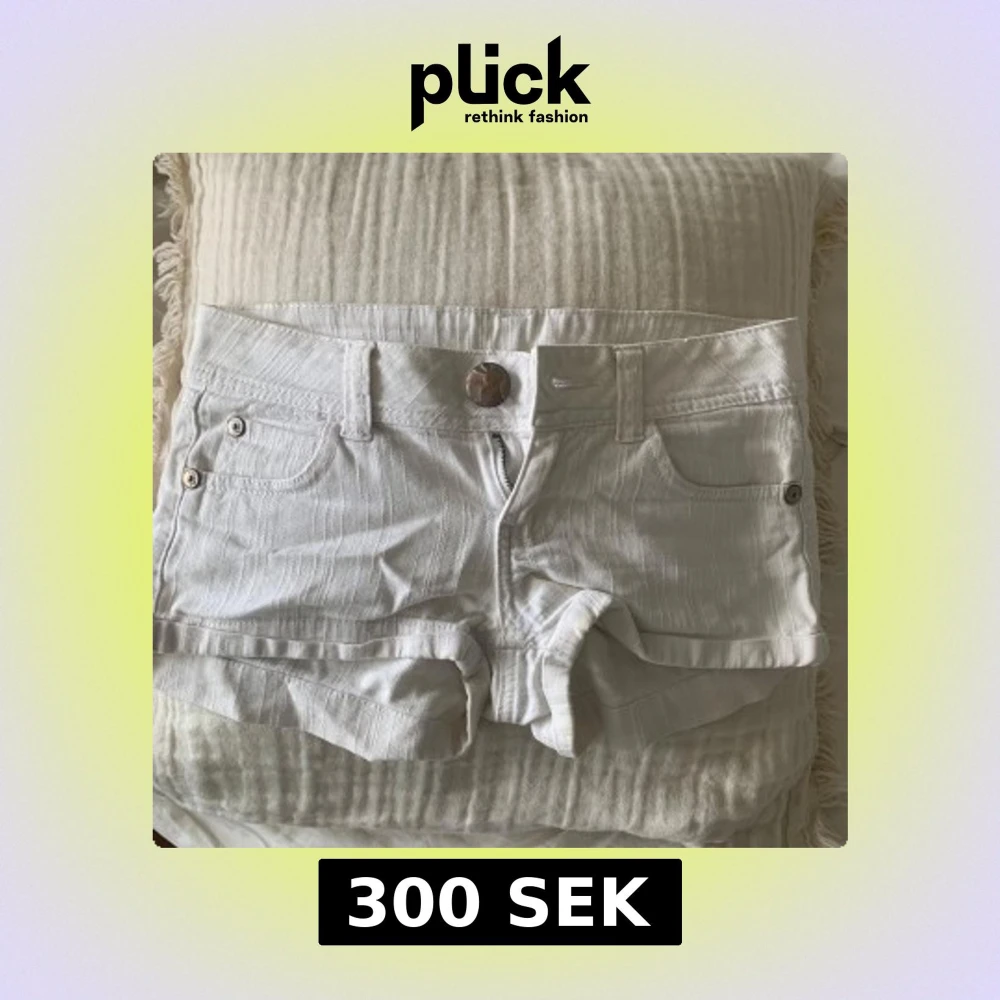 Säljer ett par vita lågmidjade jeansshorts med en stor knapp framtill. Shortsen är köpta secondhand, skriv gärna vid frågor🤍