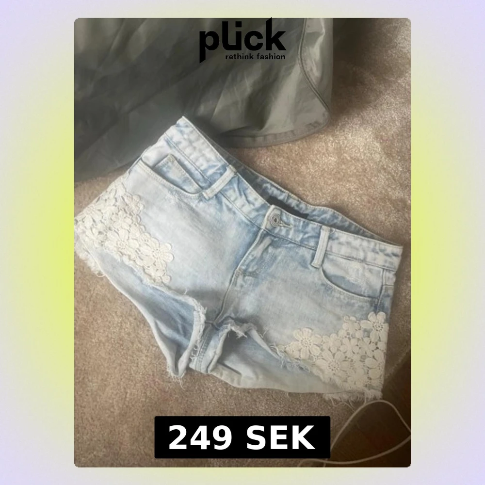 Säljer ett par ljusblå jeansshorts med vita spetsblommor på sidorna. Shortsen har fransig kant, fem fickor och bälteshällor. Perfekta för sommaren och ger en söt och avslappnad look.