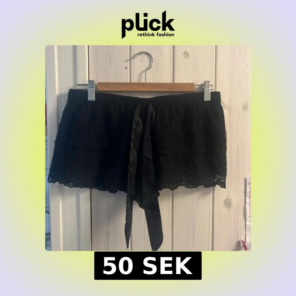 Svarta shorts med breda knytband framtill och fina spetsdetaljer längs benen. De har en lös passform och elastisk midja för extra komfort. Perfekta för varma dagar eller som mysplagg hemma.