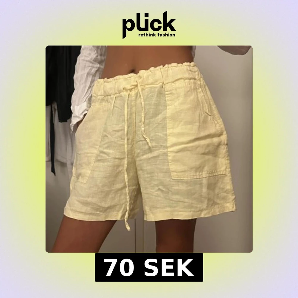 Säljer ett par ljusgula shorts i linne med hög midja och bred resår. Shortsen har snörning i midjan och stora, praktiska fickor framtill. Perfekta för varma dagar och ger en chill vibe med sin loose passform.