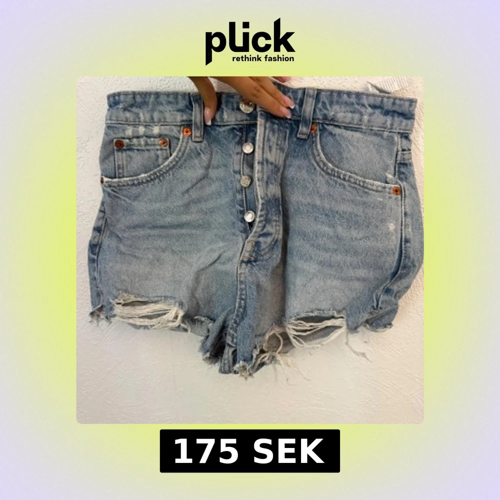 Säljer ett par högmidjade ljusblå jeansshorts med slitna detaljer och fransig kant. Klassisk femficksmodell med knappar framtill och bälteshällor. Perfekta för varma dagar och en avslappnad look.