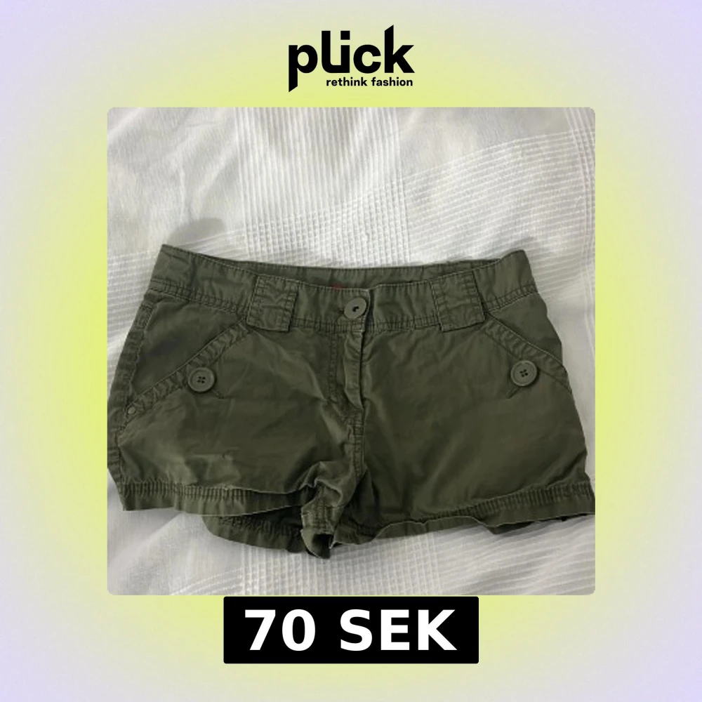 Snygga olivgröna shorts med flera fickor och dekorativa knappar både fram och bak. Modellen har midwaist och är tillverkad i ett mjukt, lätt polyestertyg som passar perfekt till varma dagar. Stilsäkra detaljer som breda hällor och knappstängning framtill. Liten i storlek och inte så stretchig. Inte avänt alls många tillfällen.