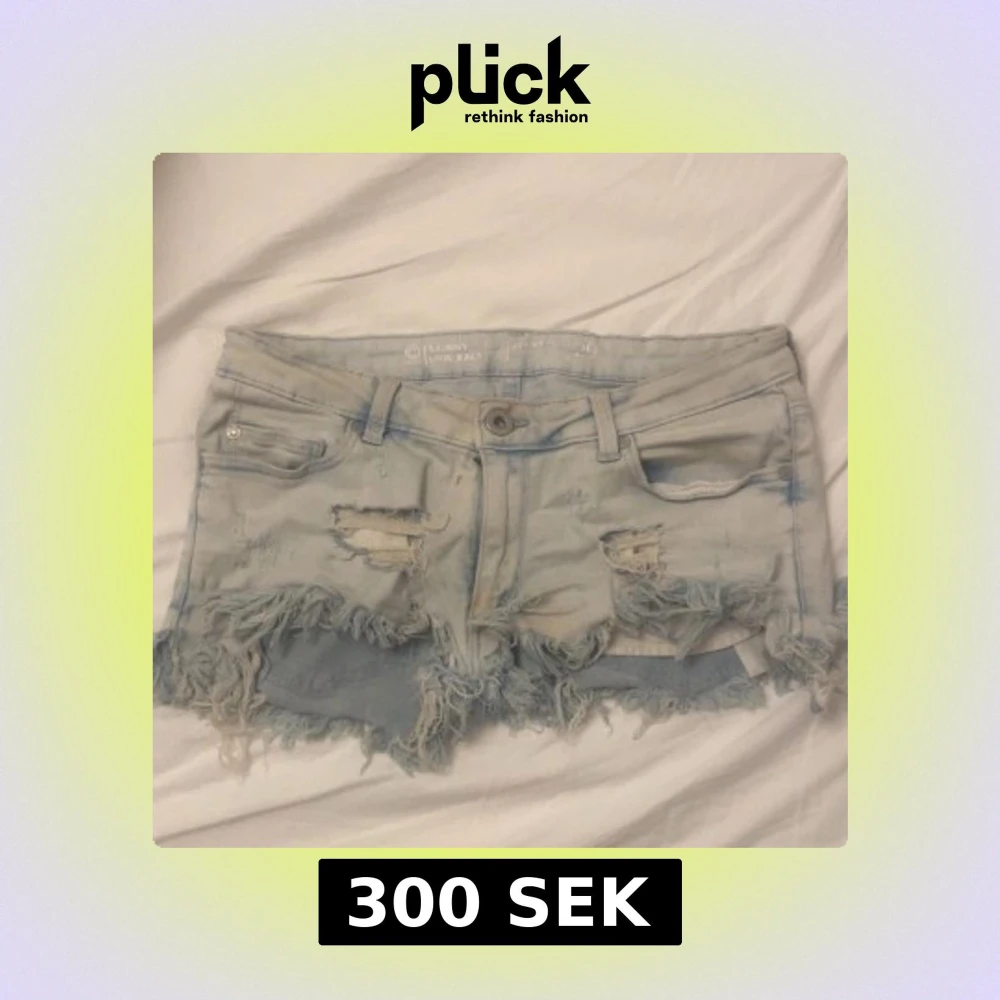 Säljer ett par ljusblå jeansshorts med låg midja och slitna detaljer. Fråga gärna om ni undrar nått💕