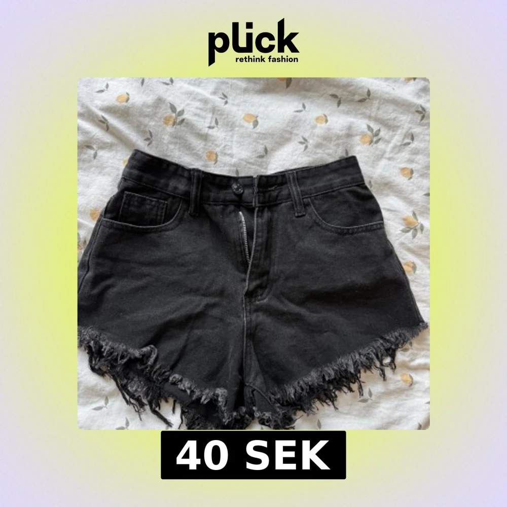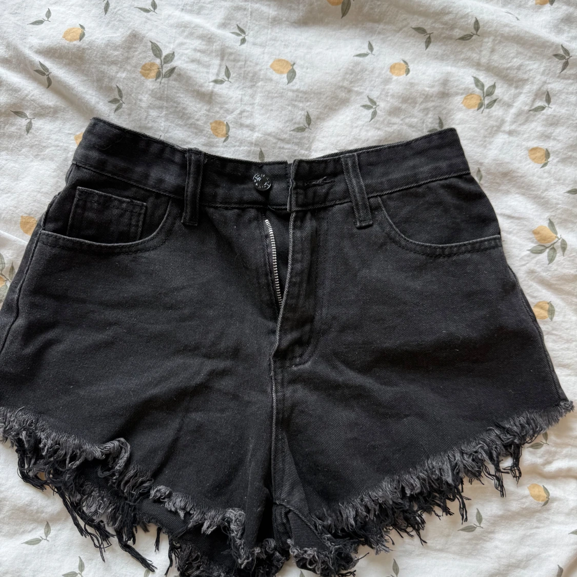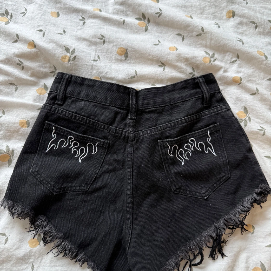 Svarta högmidjade jeansshorts med fransig kant och coola vita flames broderade på bakfickorna. Klassisk femficksmodell med dragkedja och knapp. Perfekta för en edgy sommarlook.
