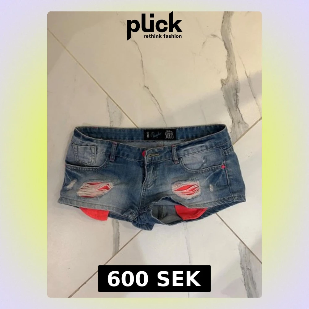 Säljer ett par blå jeansshorts från Chillin med slitna detaljer och råa kanter. Shortsen har låg midja, klassiska fem fickor och rosa detaljer som sticker fram vid slitningarna. Perfekta för sommaren och ger en avslappnad look.