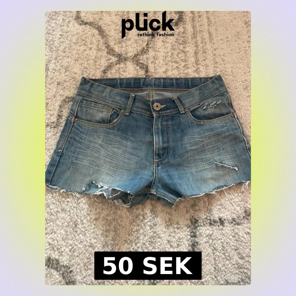 Snygga blå jeansshorts med råa kanter och slitna detaljer framtill och på bakfickan. Klassisk femficksmodell med knapp och dragkedja. Perfekta för varma dagar och en avslappnad stil.