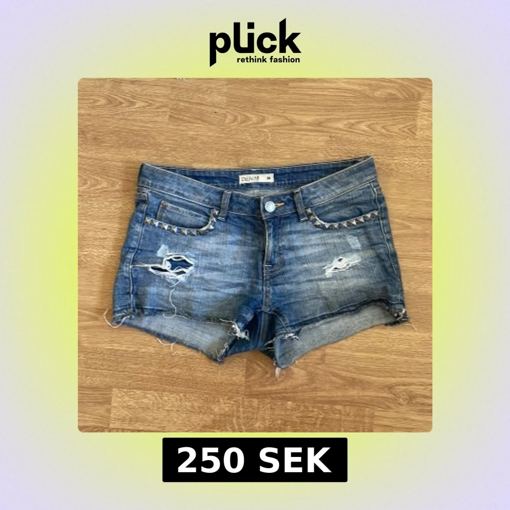 Snygga blå jeansshorts från Denim med slitna detaljer, råa kanter och coola silverfärgade nitar på fickorna. Klassisk femficksmodell med låg midja och avslappnad passform. Perfekta för sommaren och ger en edgy vibe till din outfit.